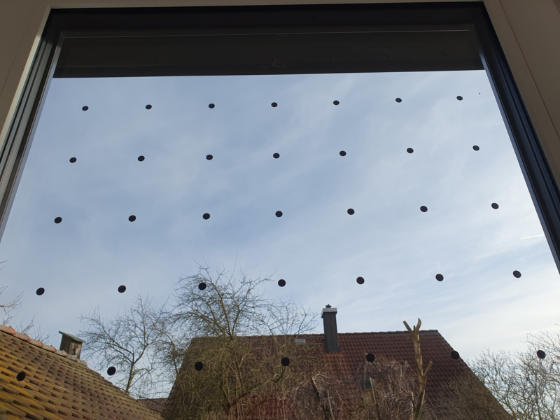 Studien haben belegt, dass auf die Scheiben geklebte, reflektierende Punkte in einem Raster von den Vögeln erkannt und damit gemieden werden.